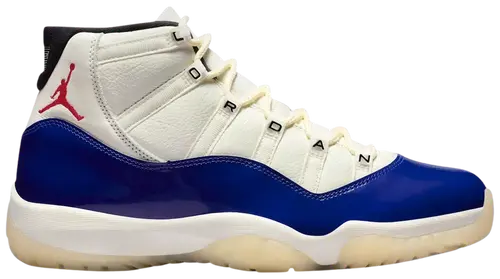 The Air Jordan 11 Retro 'Rare Air' features a white leather upper with a shiny patent leather mudguard in Deep Royal Blue. In addition to a crimson Jumpman logo on the lateral collar, branding elements include 'JORDAN' spelled out on the webbing eyelets and a stylized '23' stamped on the black textile back tab. Lightweight cushioning arrives via a Phylon midsole, fitted with full-length Air-sole cushioning and supported by a translucent rubber outsole.